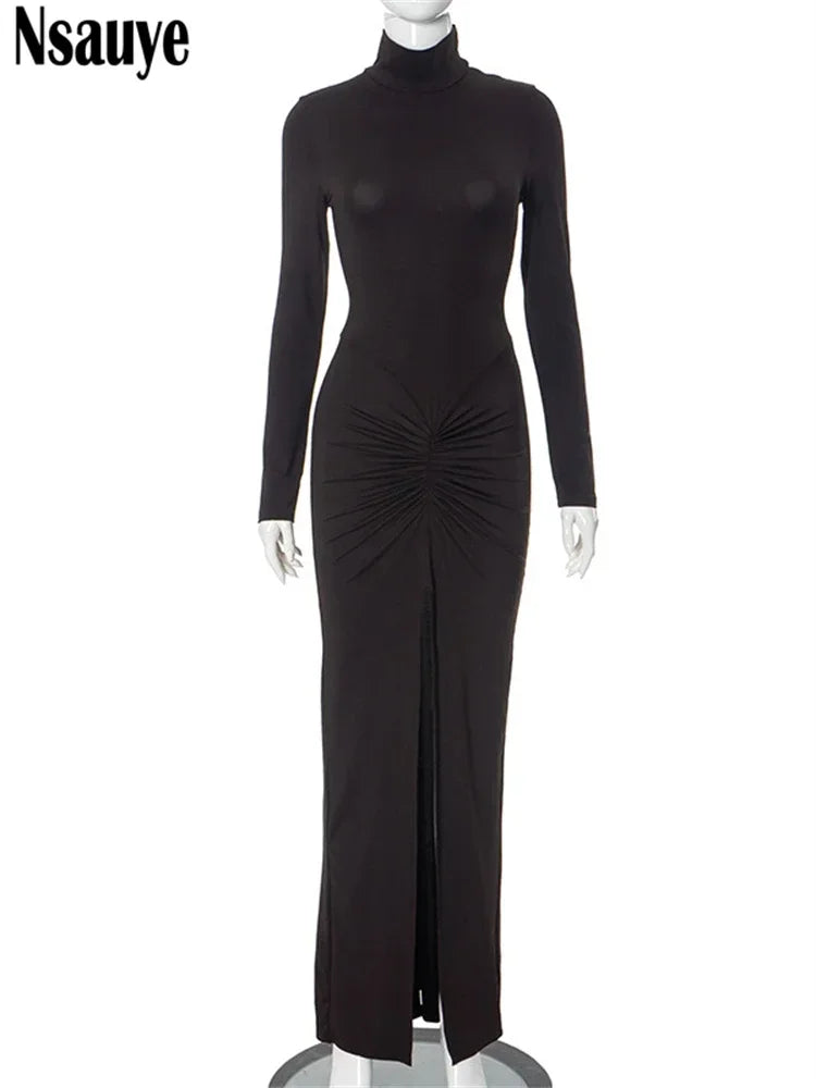 Pullover Turtleneck Long Sleeve Women Fashion Low Waisted Sexy Club Dress Party Elegant Maxi Ruched Dress Autumn