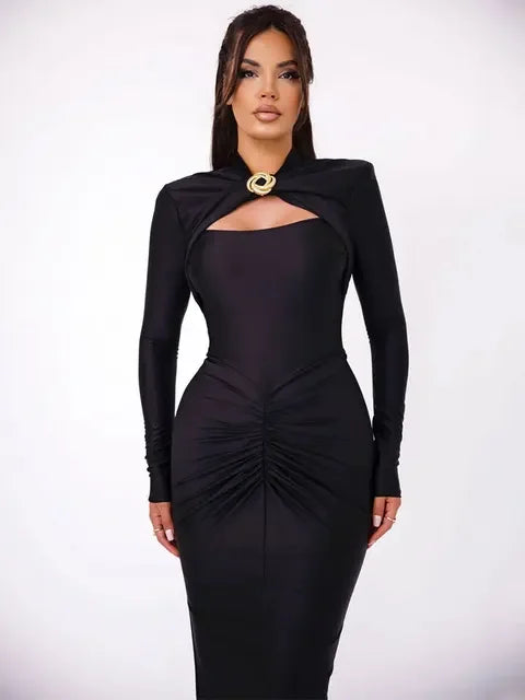 minus Sexy Hollow Out Ruched Maxi Dress For Women Autumn Winter Long Sleeve Slit Slim Elegant Party Evening Long Dress
