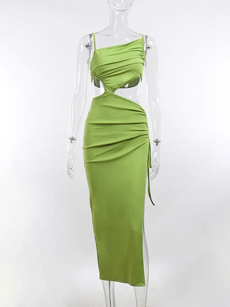 minus Spaghetti Strap Hollow Out Hem Ruched Long Bodycon Dress for Women Summer Elegant Evening Party Split Maxi Dresses