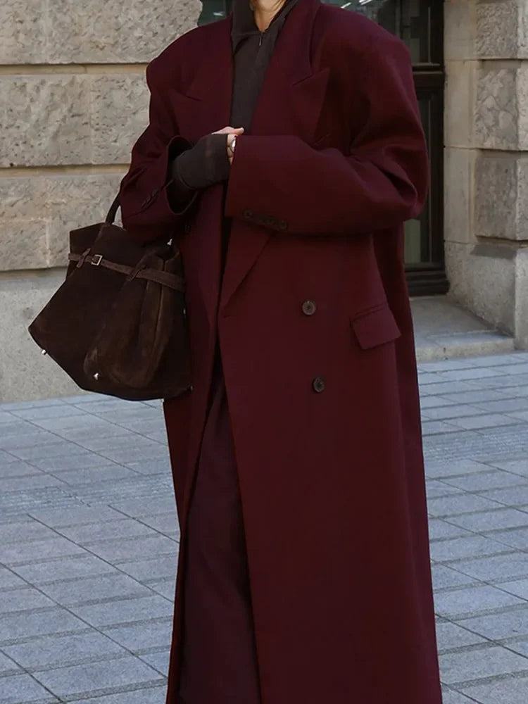 minus Vintage Wine Red Lapel Double Breasted Overcoat Elegant Loose Long Sleeve Pockets Woolen Coat Lady Autumn Commute Streetwear