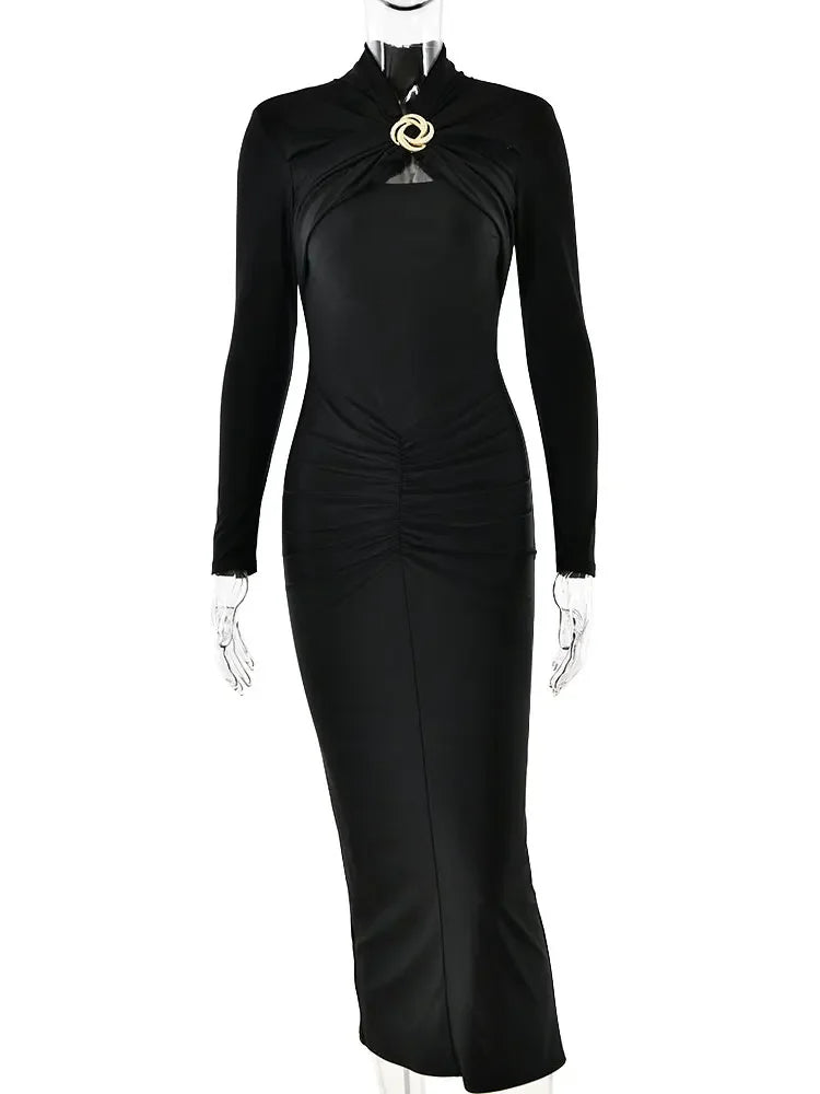 Sexy Hollow Out Ruched Maxi Dress For Women Autumn Winter Long Sleeve Slit Slim Elegant Party Evening Long Dress