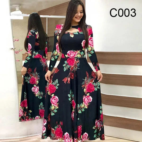 plus Spring /Autumn Fashion Flower Long Sleeved O-Neck Hollow Slim Fit Dress Women Elegant Long Vestido Maxi Clothes Robe Sexy Femme
