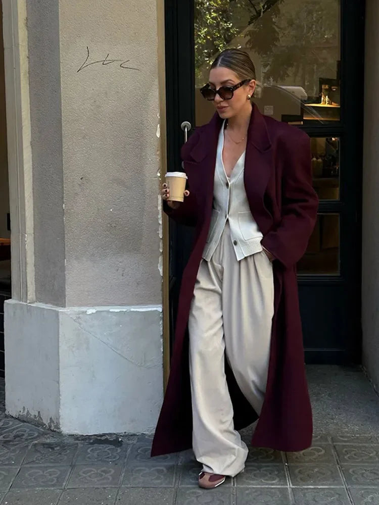 minus Vintage Wine Red Lapel Double Breasted Overcoat Elegant Loose Long Sleeve Pockets Woolen Coat Lady Autumn Commute Streetwear